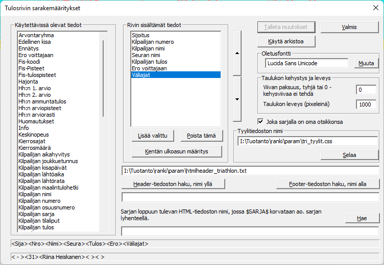 Nettituloksissa etappihistorian paikka voidaan valita vapaasti. Ohessa olen lisännyt sen rivin viimeiseksi ja merkinnyt väliajat näytettäviksi samoin etappiaikoina ja antanut vielä etapeille otsikkoihin omat nimet. Nimet ovat kesälajin nimet, esimerkin kilpailijat ja ajat taas talvitriathlonista. Nettilistauksen ulkoasua pääsee muuttamaan kirjoittamalla oman tyylitiedoston (css-tiedoston) ja antamalla sen nimen raportin määrittelynäytössä (oikealla). Minun käyttämääni pääsee tutkimaan tuosta esimerkin html-tiedostosta, ExTime kopioi sen mukaan valmistuvaan tiedostoon. |