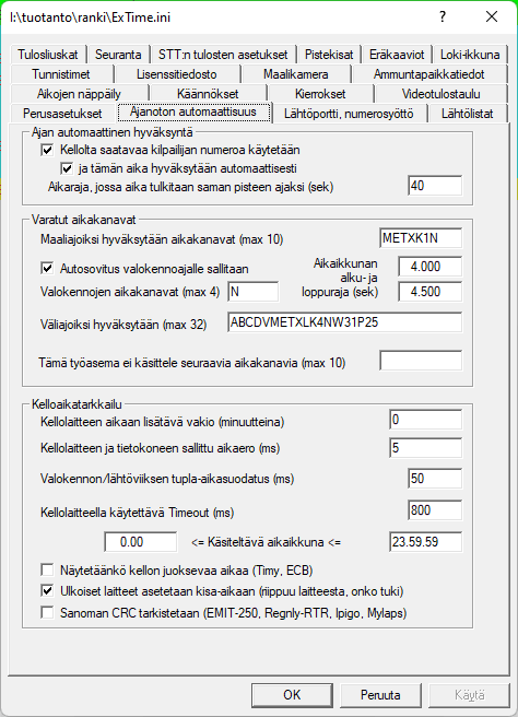 Edellä kerroin muutamasta asetuksesta, joita tarvitaan kun tunnistimien lukijaa käytetään. ExTimen ajanoton näytölle normaalisti tulevia tapahtumia voidaan vähentää, kun osa tai kaikki automaattisista ajankirjauksista rastitaan näytöltä pois. Kilpailun kuuluttajan (ja kyllä myös ajanottajankin) kannattaa tutustua kuuluttajaa varten tekemääni ohjeeseen hyvissä ajoin ennen kisaa. Tunnistinlukijoiden tieto siirtyy ExTimeen kisan aikana kun ajanoton työasemalla käynnistetään -valikosta löytyvä . uRTimeä käytettäessä tietenkin luetaan . Verkon yli luettaessa voi tapahtua häiriöitä, jolloin lukeminen kannattaa pysäyttää ja aloittaa uudelleen. ExTimen pitäisi selvitä, vaikka sama lokitiedosto luetaan uudestaan alusta alkaen. Koska itselläni ei ole käytössä uRTime-laitteistoa, en ole pystynyt testaamaan läheskään kaikkia mahdollisia poikkeustilanteita, enkä osaa niiden sattuessa neuvoa. Mutta suosittelen kertomaan tapauksista ja toimivista ratkaisuista ExTimen Facebook-ryhmässä. Tälläinen kaverien auttaminen voi jopa joskus olla itsellekin hyödyksi. |