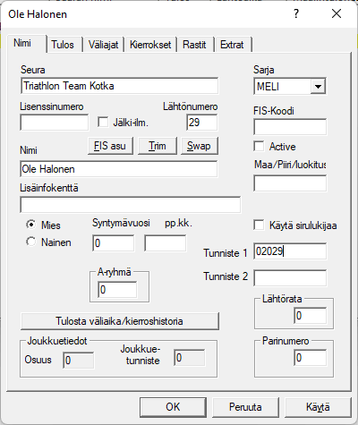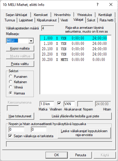 Kokonaismatkana siis 30.2 km, kun varusteiden vaihtoalueen pituus on 100 metriä, juuri pienempää matkaa ei kannata käyttää. Väliaikapisteet tunnistetaan ExTimessä siis käytetyn matkan perusteella. Jokaiselle väliaikapisteelle (ja sarjakohtaisesti) annetaan normaalisti nopein ja hitain sallittu aika, jotta väliajalle voidaan suorittaa jonkinlaisia loogisuustarkistuksia. Esimerkissä se kuitenkin on ohitettu rastimalla kohta . Tässä tapauksessa luotetaan tunnistimilta saatavaan aikaan, väliaikoja ei oletettavasti jää puuttumaan. Toinen syy rastimiseen voisi olla se, ettei väliaikojen haarukkaa pystytä kovin tarkkaan arvioimaan. Suosittaisin kuitenkin väliaikatarkistusten tekemistä, joka sarjallehan voidaan antaa omat raja-aikansa. Ja väliaikarajoja voi kilpailun edetessä muuttaa, jopa toteutuneiden väliaikojen avulla. |