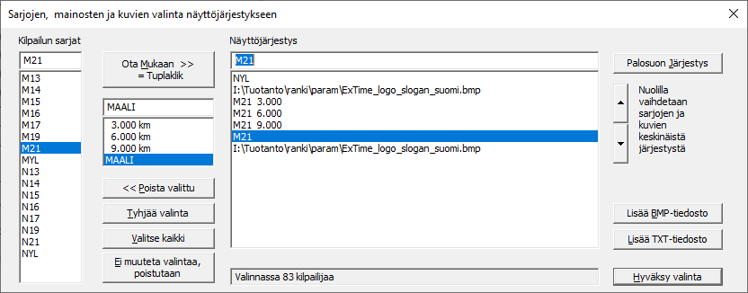 Playlist on sarjojen, tiedostojen ja kuvien luettelo, joita tulostaululla näytetään annetun ajan verran annetussa järjestyksessä. Kunkin sarjan tilanne näytetään annetusta paikasta (väliaikapiste/maali) aloittaen sijasta yksi näyttö kerrallaan sarjan loppuun saakka. Sarjan kaikkien urheilijoiden (joilla on tulos) tultua näytetyksi, näytetään seuraavaa väliaikapistettä, sarjaa, tekstitiedostoa tai kuvaa. Oikean puolen esimerkissä (kisan puolessavälissä) näytetään sarjoja NYL ja M21 (AH:n SM-kisat), M21-sarjasta ensin väliaikapisteet ja lopuksi maali. Sarjojen välissä mainostetaan 5 sekuntia ExTimeä. Lähtöluetteloita tai sarjojen johtajia ei playlistin avulla voi näyttää, vain sarjan tilannetta tietystä kohtaa. |
