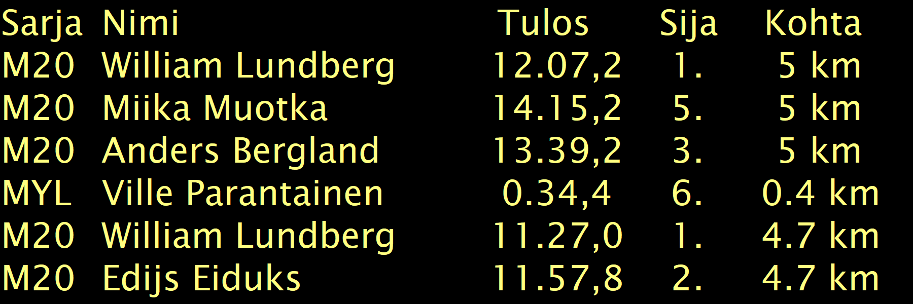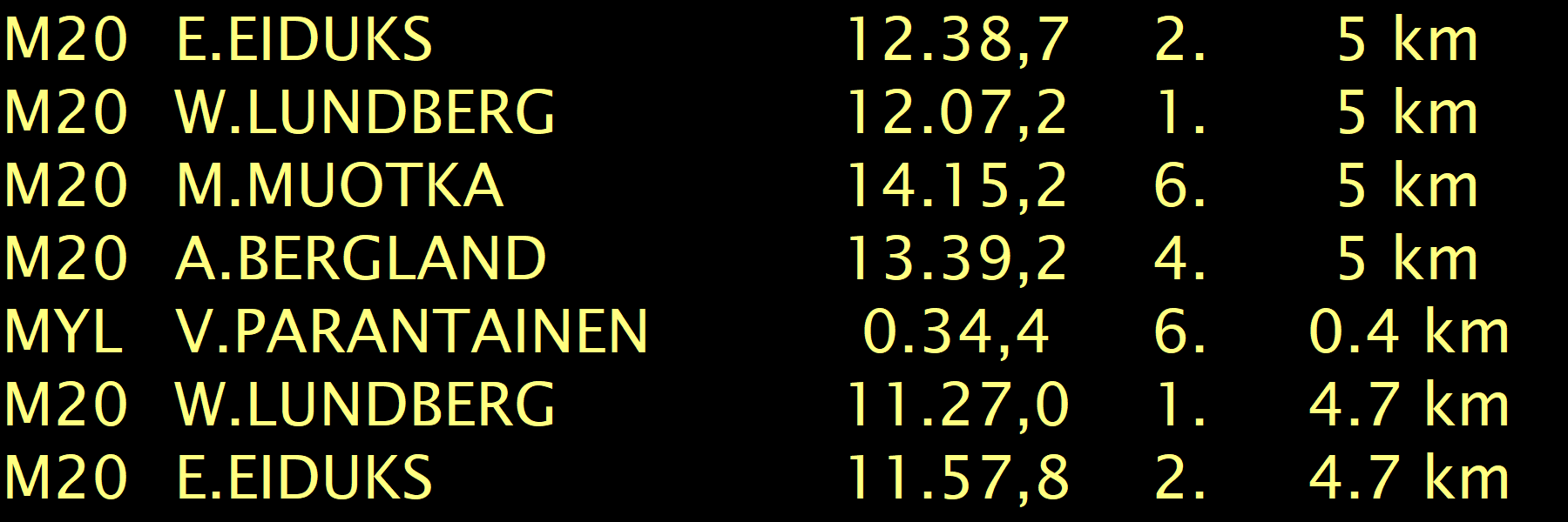 Tapahtumat tulevat taululle tapahtumajärjestyksessä, uusin aina ylimmäksi. Vanhimmat tapahtumat katoavat ruudun alareunasta bittien taivaaseen. Näytön ylin rivi on siis M20 sarjan William Lundbergin 5 km väliaika, jolla hän johtaa. Neljännen rivin aika on MYL-sarjan Ville Parantaisen 0.4 km väliaika, sarjan tähän asti kuudenneksi paras. Ja huomaa ! Aina kun vaihdat joko kirjasinlajia tai sen kokoa, tulee näyttöjen tietojen sarakepaikat säätää kohdalleen. Nyt toivottavasti nappi nopeuttaa säätämistä. |