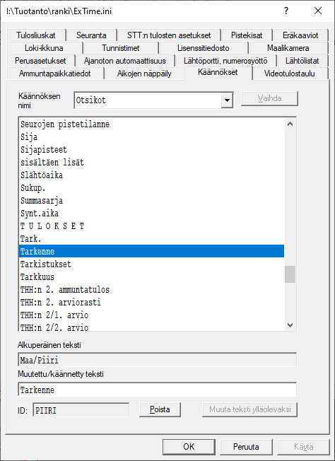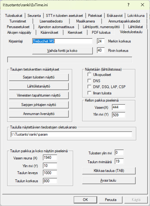Jokaisessa näytössä käytetään samaa fonttia ja fontin kokoa. Samoin se, että näytetäänkö tauluilla kisasta poisjääneiden, ulkopuolisten, jne tietoja on kaikille näytöille yhteinen. Taululla voidaan näyttää myös kisakelloa, sen vasemman yläkulman koordinaatit annetaan osiossa ruutuihin ja . Jos ne ovat nollaa, kelloaikaa ei näy. Alimpana on sitten se tärkein fyysinen tieto, eli kuinka suuri tulostaulu on pixeleinä (leveys ja korkeus). Taulun paikka (vasen yläkulma) tarkoittaa sitä paikkaa käytettävän ExTime-PC:n näytönohjaimen avaruudessa, joka kopioidaan videotaululle (tai isolle telkkarille) näytönohjaimesta lähtevällä kaapelilla. Esimerkkinä tilanteesta, jossa PC:ssä on kaksi näyttöä, toinen vaikkapa 1920 * 1080 ja toinen 1024 * 1280 voidaan jälkimmäinen näyttö valjastaa pelkkään tulostaulunäyttöön antamalla sen vasemman yläkulman paikaksi 1940 ja 0 ja kooksi vaikkapa 1800 * 850 ja valitsemalla hyvin iso fontti, yli 50 pixeliä. Rivimäärä ja rivin pituus löytyvät sitten kokeilemalla. napin avulla voidaan videotaululla tarkistaa tietyn hiirellä osoitetun paikan koordinaatit. (, vie hiiri videotaululla haluttuun kohtaan ja paina vasenta nappia, silloin näet paikan x/y koordinaatit tulostaulun koordinaatistossa, siksi taulu pitää olla auki.) Kun nämä säädöt on kertaalleen tapeltu läpi, ne ovat ja pysyvät useamman vuoden. tuo taulun näkyviin, sen on oltava näkyvissä kun kirjasinlajia tai taulun värejä muutetaan. Ohjeteksti muistuttaa. Tätä asetusarvo-näyttöä voidaan käyttää myös tulostaulun varsinaisen ohjauksen ollessa käytössä. Asetuksissa tehtävät muutokset vaikuttavat taulun toimintaan, kun hyväksytään (nappi ). Videotaulun ohjaus-näytöllä on sitten napilla päivitettävä tilanne. |