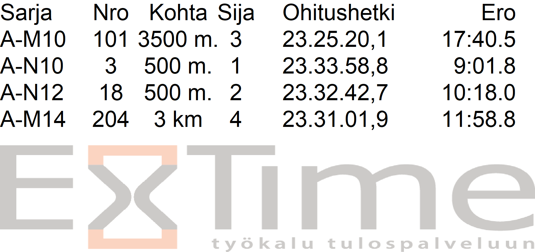 Esimerkissä oikealla ei ollut rastittuna lähtörivin sarakepositioiden jälkeistä -ruutua, joten urheilijan nimi tulostetaan kokonaan. Sen sijaan rastittuna oli -ruutu, joten listalle näkyy sarakeotsikot. Ja jos joku ihmettelee, miksi maakoodin paikalla lukee otsikossa teksti , niin häneltä on jäänyt huomaamatta, että ExTimessä voi ohjelman vakiosanoja itse kääntää eri kielelle. Tai kuten tässä tapauksessa vain vaihtaa ohjelman tekijän käyttämä sana toiseksi. Malli äärimmäisenä oikealla. Lisäohjeita listausten kielen vaihtamisesta löytyy täältä. |