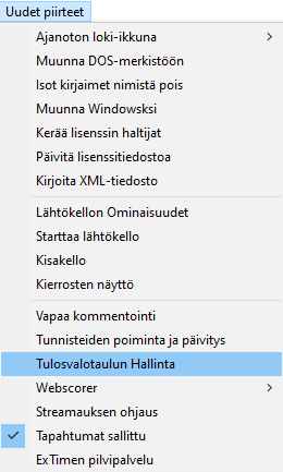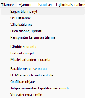 Salmisen Teemu heitti idean, että valotaululla (älytelkkarilla) voitaisiin näyttää HTML-tiedostoa, joka päivittyisi kohtuullisen usein. Niinpä toteutin sitten online-tulostuksen ja tulostaululiitännän risteytyksen, joka löytyy -valikon kohdasta . Saas nähdä kelpaako. (Kelpasi, latojan huomautus) Tässä toteutuksessa on valittavissa 3 erilaista peruslistaa: