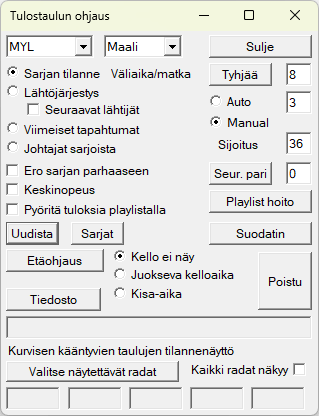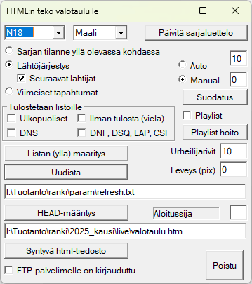 Valotaulu-HTML ohjaus näyttö on kuvassa oikealla. Ja nyt on ero online-tulostukseen: Kun ohjausnäyttö suljetaan, loppuu tulostuskin. Eli tarkoitus on, että kuuluttaja (showmaker) pitää ohjausnäyttöä auki ja ohjaa näkyviin kulloinkin aktiivista toimintaa. Ja jos maaliintulijoita ei ole, näytetään sitten vaikka seuraavia lähtijöitä. Ylimmät kaksi valintalistaa ovat sarjan ja kohdepisteen valintoja varten. Jos valitussa sarjassa ei ole väliaikapisteitä eikä kierroslaskentaa, näkyy kohdepisteenä vain MAALI. -nappia käytetään silloin, kun kesken kisan lisätään uusia sarjoja (yleensä sprintin eriä). Valinnat ja valitsevat automaattipyörityksen ja käsin annettavan päivityksen välillä. Ylempi lukuarvo (kuvassa luku 10) kertoo automaattipäivityksen tiheyden ja alempi (kuvassa 0) vaihtuva luku ilmoittaa monenko sekunnin jälkeen autopäivitys tapahtuu. Siis ihan kuin tulostaululiitännässä. Auto-päivityksessä pysytään samassa sarjassa, seuraava näyttö jatkaa edellisen päättymiskohdasta ja sarjan kaikkien urheilijoiden tultua näytetyksi, aloitetaan sarja taas alusta. Tulostaululiitännästä tuttu Playlist tuli mukaan, kun kovasti sitä toivottiin ja toimii siellä kuvatulla tavalla. Napilla päästään vaihtamaan yläpuolisella pallukalla valitun listan ulkoasua. Nappi tuottaa uuden listauksen, listaus alkaa kuvan kohdasta valitusta sarjasta, listalle tulee kohdassa (25) merkattu määrä urheilijarivejä. Aloitussija-teksti vaihtuu valitun listan mukana vaihtoehdoissa Lähtönumero/Sijoitus. Voit siis tehdä jokaiselle kolmelle listavaihtoehdolle oman mallinsa. -näytössä käytetään myös tapahtumapisteen suodatusta. -napilla voidaan valita ne väliaikapisteet, joiden tapahtumat näytetään ja mitkä suodatetaan pois. Viimeiset tapahtumat-näytössä kannattaa aina näyttää myös kilpailijan sarjaa, mutta ei mitään yleisiä otsikoita. Jos FTP-palvelimeen on kirjauduttu (valikko ), silloin kohta näkyy rastittuna ja syntynyt HTML-tiedosto jatkaa matkaa heti FTP-palvelimelle. Tiedosto nimi näkyy napin yläpuolella ja nappia klikkaamalla tiedostolle voidaan antaa uusi kansio ja nimi. Itse suosin kausikohtaista live-kansiota, kuten kuvasta näkyy. Jos tiedonsiirron hoitaa esim. FileZillalla tai WinSCP:llä, niin tuo kansio on helppo synkata palvelimen kansion kanssa. Napilla valitaan syntyvän HTML-tiedoston head-lohkoon liitettävä tekstitiedosto (nimi näkyy siinä yläpuolella), joka minulla on aina sama vakio, sama kuin online-tulostuksissa. Tiedoston sisältö kertoo html-tiedostoa pyörittävälle selaimelle, kuinka usein se lataa automaattisesti uuden tiedoston palvelimelta. |