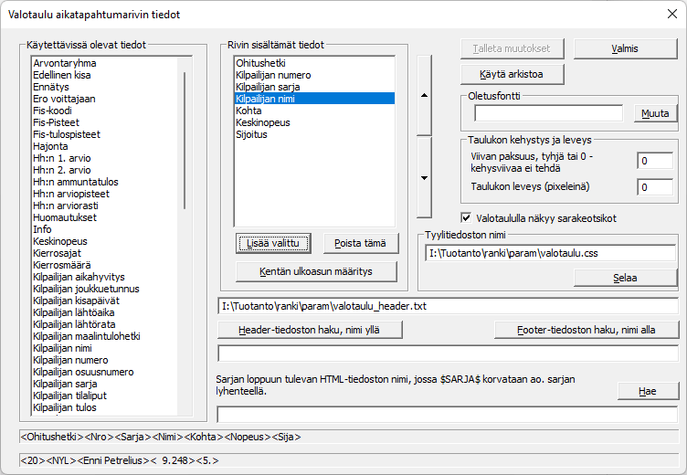 Näytön vasemmassa reunassa näkyy mahdolliset valittavat tiedot, valittuina niitä voi olla enintään 10. Osa tiedoista on urheilijoiden vakiotietoja, osa lasketaan 'lennossa', esimerkiksi sijoitus tietyssä väliaikapisteessä.
