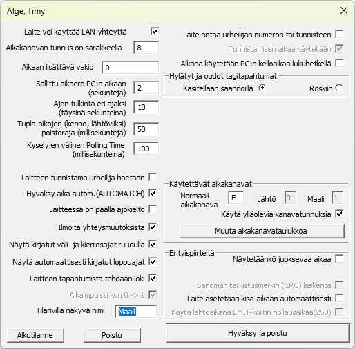 Kesällä 2014 poistin laitevalikoimasta myös muutaman laitteen, joita en tiedä kenenkään enää käyttäneen. Ihan jokaista kellolaitetta en ole voinut käytännössä kokeilla, joten tarkistakaa mahdollisimman pikaisesti oman laitteenne toiminta ja antakaa palautetta. Jokaiselle kellolaitteelle voidaan nyt myös käyttää yleisiä asetuksia, kuten kellolaitteen ja PC:n välisen aikaeron tarkkailua sekä kellolaitteen ja kilpailuajan välinen vakioero. Näistä lisää alempana.