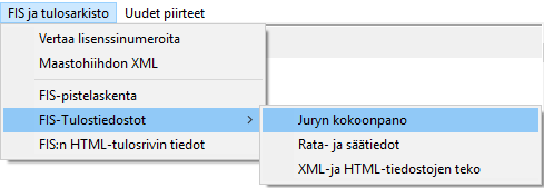 Versiosta 8 alkaen juryn, ratatietojen ja säätietojen ilmoittamista varten on ExTimessä omat näyttönsä, esimerkissä oikealla. Lähtölistojen asetusarvoihin on tullut yksi rastittava kohta lisää, . Kohdan ollessa rastittuna tulostuu toiminnolla lähtölistan yläosaan tuomarineuvoston kokoonpano sekä radan korkeusero ja maksiminousutiedot. Tämä lisäys johtuu 2018 voimaan tulevista uusista FIS-säännöistä. Samasta syystä on tulosliuskojen asetuksissa uusi optio, . Rastittuna tulostuu syntymävuoden perään myös kuukausi ja päivä, jos sellainen on urheilijan tiedoissa FIS:n tietokannassa. Sama rasti vaikuttaa myös itserakennetun HTML-lähtölistan syntymäaikaan. |
