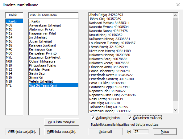 Lista avataan suosikkiselaimeen (Chrome/Firefox), ja sillä tehdyn paperitulosteen voi sitten arkistoida vaikkapa seuran mappeihin.