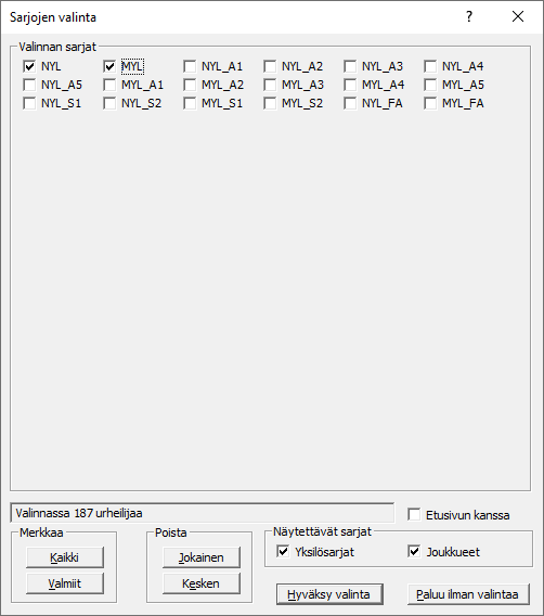 -valikon välilehdellä rastitaan oikealla keskellä olevista ruuduista ainakin ruutu . Ja jos yhteenvedossa halutaan nähdä, keistä urheilijoista tulos koostuu, rastitaan myös kohta . Ylhäällä vasemmalla rastitaan , jos tarpeen. Sekä harkitaan käytettävä ajan tulostustarkkuus ja muutkin asetukset. Sarjakohtaisesti laitetaan Sarjan tietojen -välilehdellä täppä kohtaan . Lisäksi määritetään onko joukkueen koon oltava tietty (0=ei rajoitusta) ja miten yhteistulos kohdistetaan seuralle/piirille ja mitä summataan, aikaa vai pisteitä. -välilehdellä sitten ilmoitetaan käytettävä kaava. Alla on sitten erilaisia esimerkkejä siitä, miten eri tavalla voidaan seurakisan tuloksia laskea. Valitkaa mieleisenne. Otsikko Seuratilanne käännetään ruotsiksi (tai vaihdetaan Piiritilanne-sanaksi) / ikkunan välilehdellä vaihtamalla -lohkossa sana Seuratilanne (=STILANN) sanaksi Samma på svenska tai Piirien kisa sanaksi. |