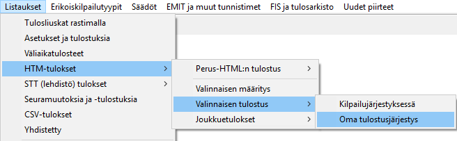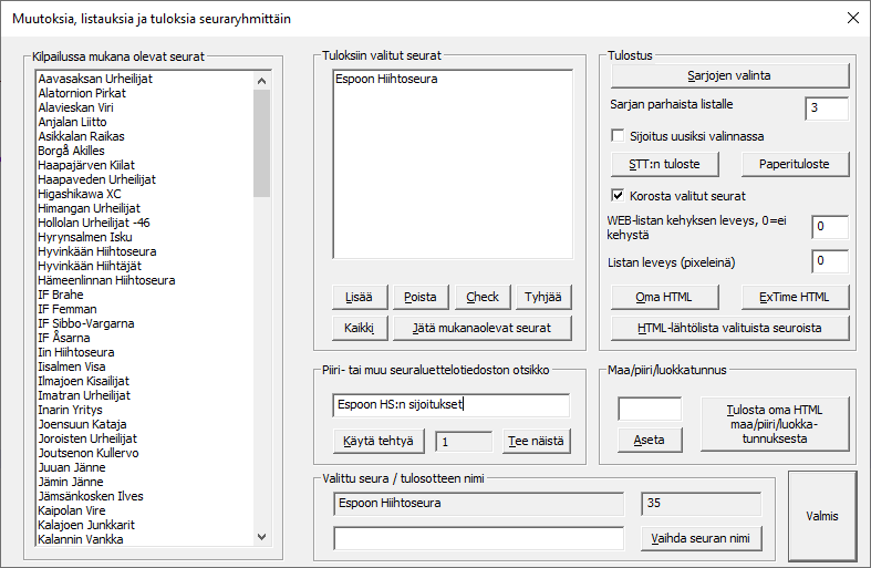 HTML-tulosteissa tiedostoa ei tarvitse valita ennakkoon, ExTime kysyy tulostuksen alkaessa tiedoston nimen. Tiedostosta voidaan tehdä myös yhtä sarjaa koskeva vakioniminen, vakionimi muodostuu kisan vuosiluvusta, kisan kalenterinumerosta ja sarjan lyhenteestä. HTML-tulosteet voi tulostuksen jälkeen avata selaimessa ja sitten tulostaa kirjoittimelle. Perus-HTML on paperitulosteen näköinen web-sivu, kun taas valinnainen on se, jonka värit, logot, urheilijatiedot ja niiden sarakejärjestyksen voi itse valita. Valinnaisenkin voi tulostaa joko sarjojen kilpailujärjestyksen mukaan tai itse päätetyssä järjestyksessä. |