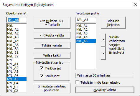 Jos tulostettavia sarjoja on useampia kuin yksi, tulostiedoston alkuun tulostetaan navigointinapit halutun sarjan saamiseksi nopeasti esille ja sarjan tulosten loppuun tulostuu taas linkki tähän sarjojen hakulinkki osioon.