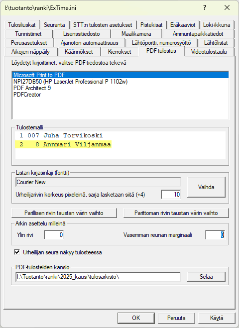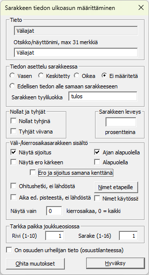 Määrittelyjen alaosassa voidaan väliaikatietoja säätää tarkemmin ja ilmoittaa, kuinka monta kierrosaikaa enintään näytetään. Tietysti aina xx viimeisintä, jos xx:ää ei anneta, niin kaikki 24 kierrosaikaa 10 km juoksukisassa näkyvät.