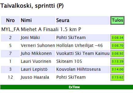 <div class='SARJALUETTELO'><a name="Sarjat"><b>Kilpailun sarjat: </b></a><a href="#NYL_FA">NYL_FA</a>; <a href="#MYL_FA">MYL_FA</a>; <a href="#M18_FA">M18_FA</a>; <a href="#N18_FA">N18_FA</a></div>Tämän näyttämiseen eri väreillä ja eri tavalla muotoiltuna on jo muutama seura tehdyt omia tyylisääntöjään. Niistä ei nyt enempää, malleja löytyy netistä. Siitä vain tutkimaan, miltä ExTimellä tehtyjen html-sivujen lähdekoodi näyttää.